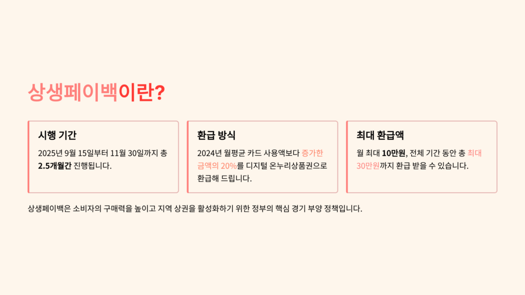 결국 상생페이백 제도는 단순한 환급 정책이 아니라, 소비자가 지역 상권에서 실질적으로 혜택을 체감하도록 설계된 시스템이라 할 수 있습니다. 다만 혜택을 극대화하려면 카드 사용처 제한을 꼼꼼히 확인하고, 불필요한 소비 대신 계획된 지출 속에서 혜택을 챙기는 것이 가장 현명한 방법입니다.