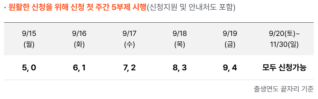 예를 들어 출생연도 끝자리가 5나 0인 사람은 9월 15일(월요일)에, 6이나 1인 사람은 9월 16일(화요일)에 신청할 수 있습니다.