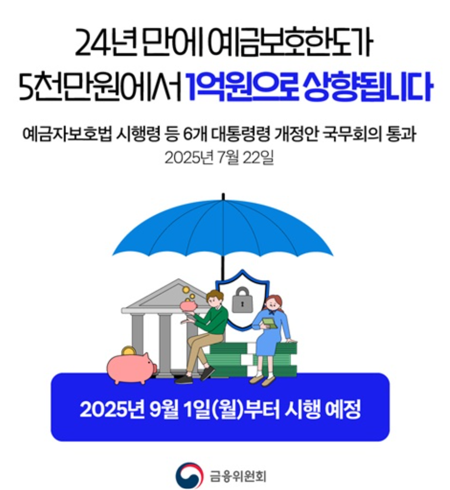 바로 예금자 보호 한도가 기존 5천만 원에서 1억 원으로 상향되는 것입니다. 금융위원회가 개정된 「예금자보호법 시행령」을 발표하면서, 은행·상호금융조합·금고 등이 파산할 경우 예금자들이 보호받을 수 있는 금액이 두 배로 늘어나게 되었습니다.