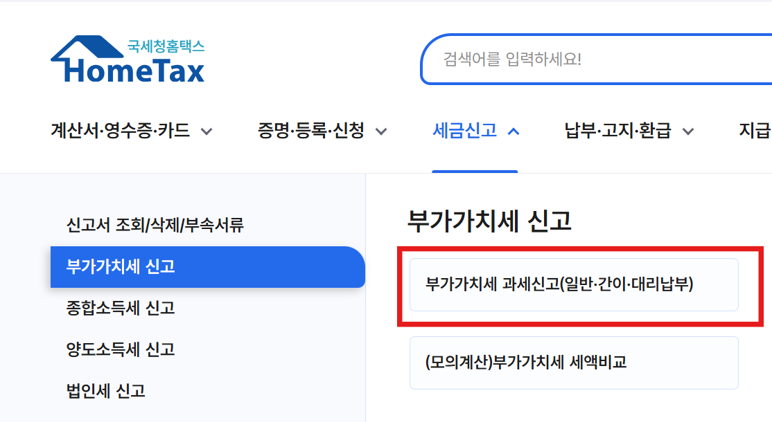 신고 절차: 세금신고 납부 메뉴에서 부가가치세를 선택합니다.