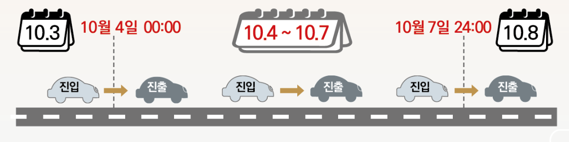 예를 들어 10월 3일 자정 이전에 고속도로에 진입한 차량이 4일 새벽에 빠져나가거나,