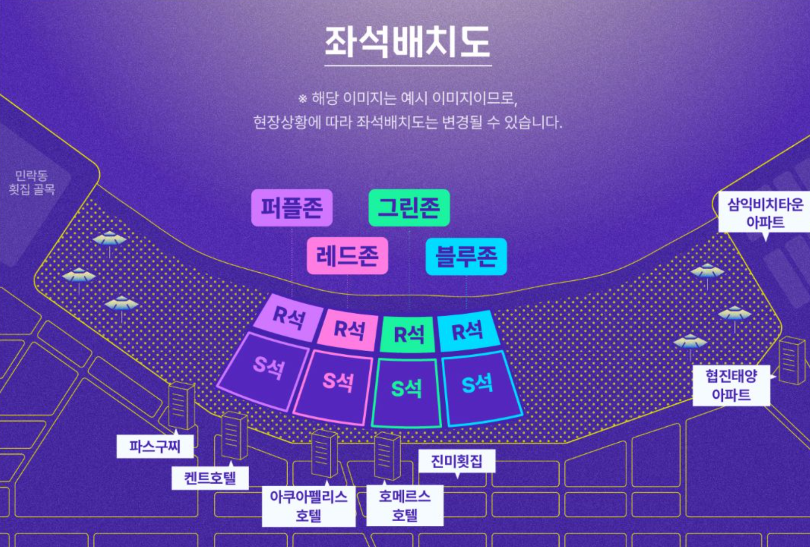 유료 구역은 퍼플존, 레드존, 그린존, 블루존 등으로 나누어 배치되어 있으며,