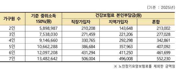 * (예) 2025년 기준 2인가구(2인 모두 직장가입자로 가정)의 건강보험료 본인부담금 합산액이 210,208원 이하인 경우를 말합니다.