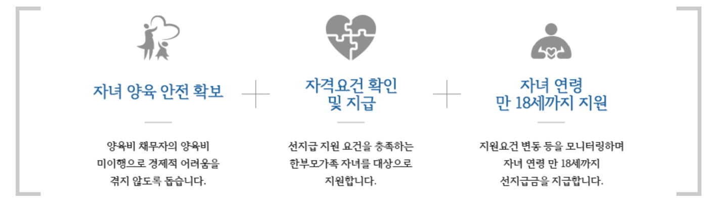 긴급 생계 지원: 양육 부 모가 비양육 부 모의 양육비 지급이 이루어질 때까지의 긴급한 생활 안정을 위해 국가가 먼저 자금을 지원하는 것입니다.