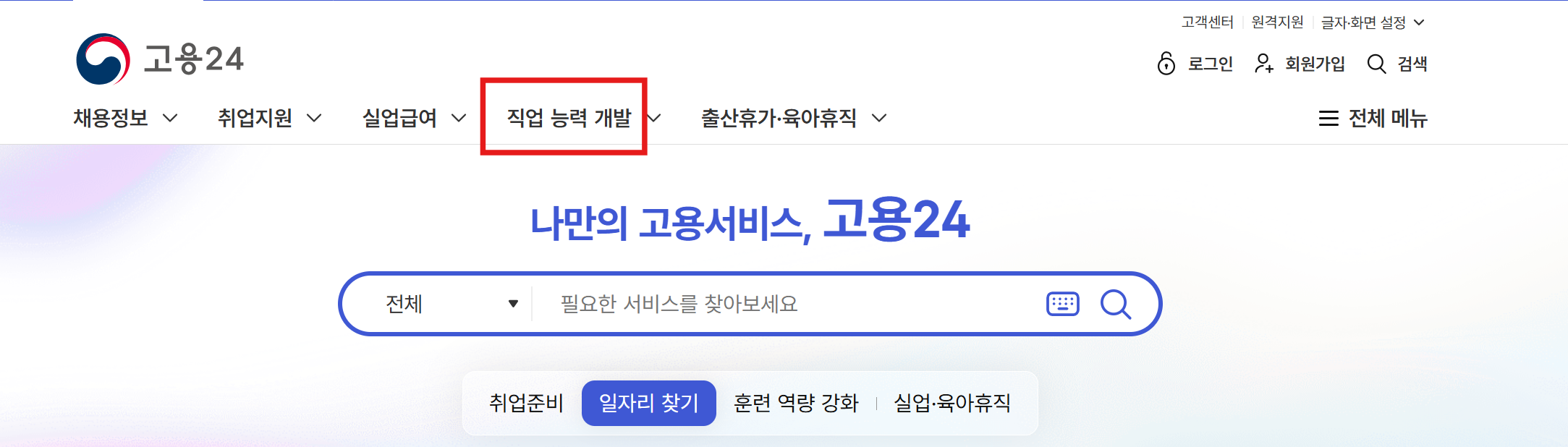 먼저 홈페이지에 접속하여 로그인을 한 뒤 상단 탭에서 직업 능력 개발 항목을 누릅니다.