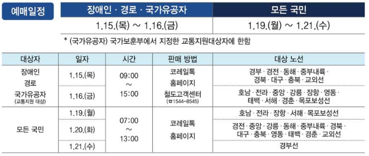* 잔여석 판매: 1.21.(수) 15시부터 코레일톡, 홈페이지, 역 창구 등에서 상시 판매 *